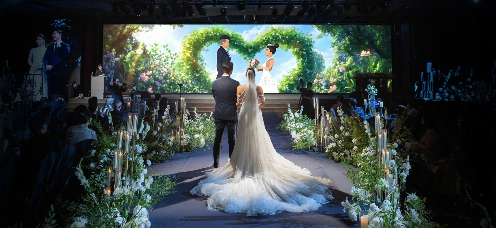 Because the wedding hall’s screen was a 4:1 panoramic ratio, the central visuals were placed in the middle with minimal scene transitions. The video was composed with calm, lyrical cuts resembling static frames from classic animation. To achieve a 2D aesthetic, toon shading with Octane Render was used, and AI-generated background elements were composited into the final film within the pipeline.